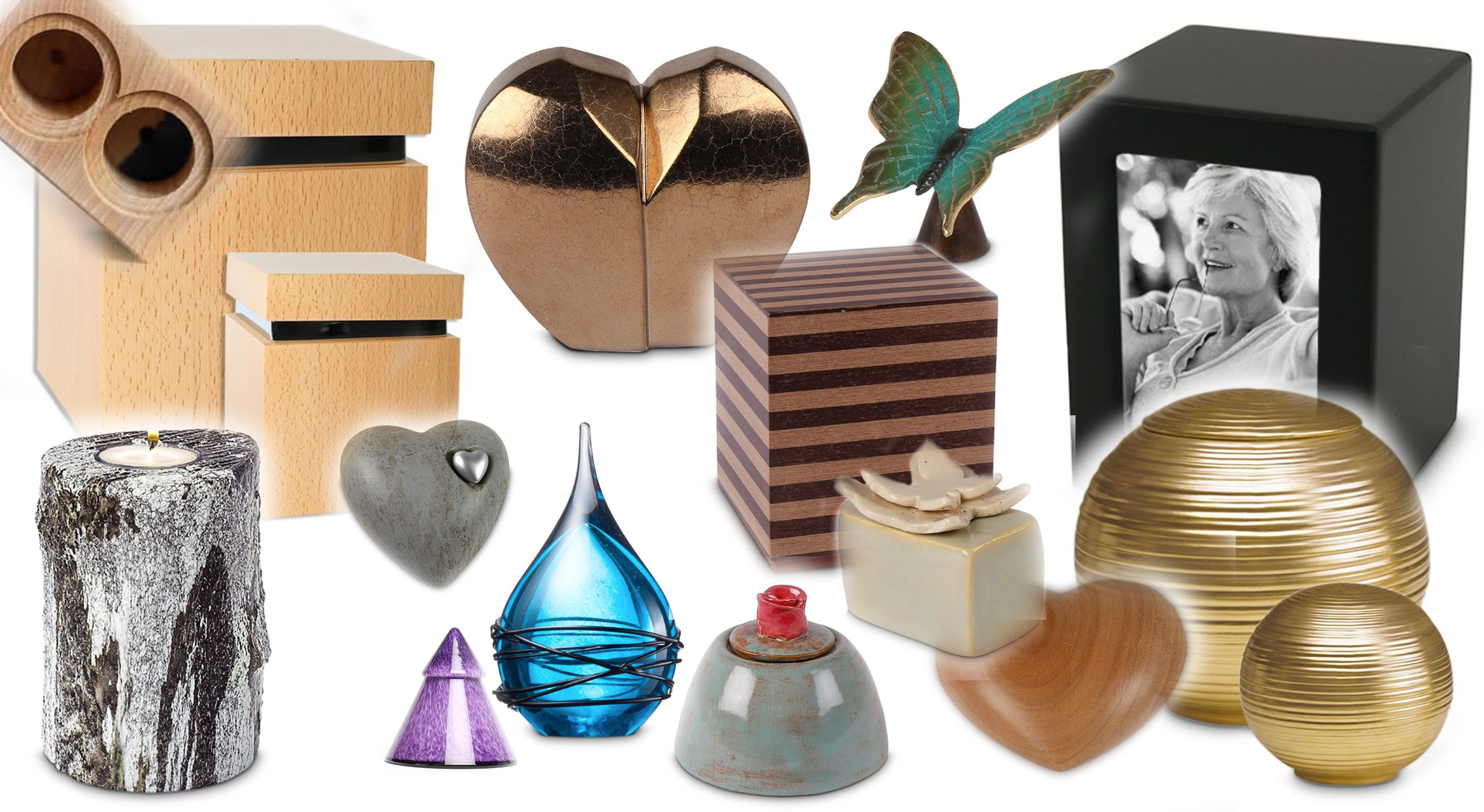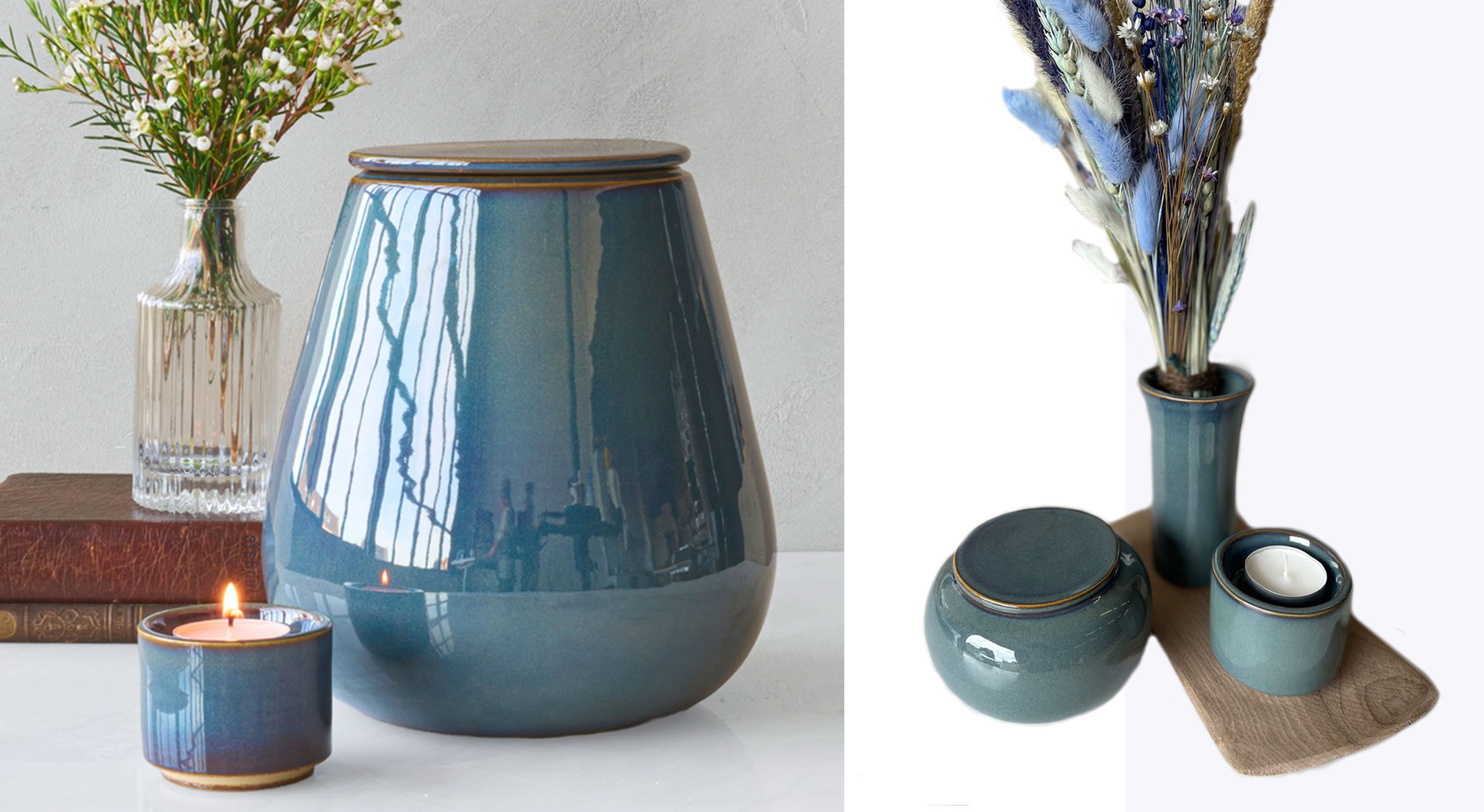 Mini urnen, knuffelsteentjes, as-theelichtje, opzet- of inschuifplankjes verkrijgbaar in verschillende kleuren mat of glazuur.
